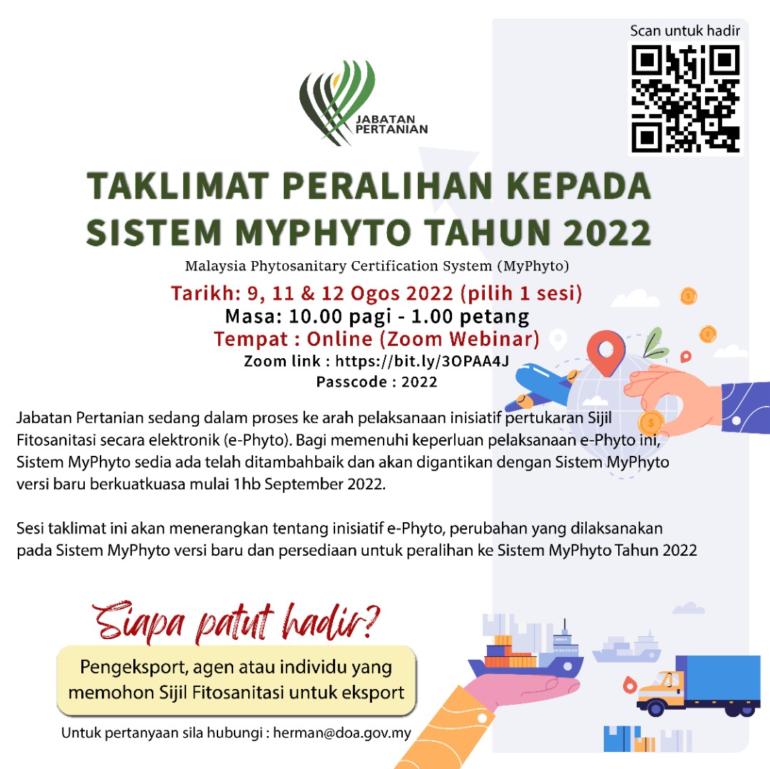Jabatan Pertanian sedang dalam proses ke arah pelaksanaan inisiatif pertukaran Sijil Fitosanitasi secara elektronik (e-Phyto). Bagi memenuhi keperluan pelaksanaan e-Phyto ini, Sistem MyPhyto sedia ada telah ditambahbaik dan akan digantikan dengan Sistem MyPhyto versi baru berkuatkuasa mulai 1hb September 2022.<div><br></div><div>Sesi taklimat ini akan menerangkan tentang inisiatif e-Phyto, perubahan yang dilaksanakan pada Sistem MyPhyto versi baru dan persediaan untuk peralihan ke Sistem MyPhyto Tahun 2022. </div><div><br></div><div>Tarikh: 9, 11 dan 12 Ogos 2022 (sila pilih satu sesi sahaja)</div><div>Masa: 10.00 pagi - 1.00 petang</div><div>Tempat: Online (Zoom Webinar)</div><div>Zoom Link: https://bit.ly/3OPAA4J</div><div>Passcode: 2022</div><div><br></div><div>Tuan/ puan dijemput hadir. </div><div>Sesi taklimat ini adalah percuma.</div>